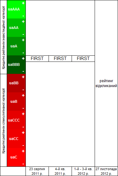 | 2 | Підтвердження | 22.11.2011 | uaBBB+ | стабільний | FIRST-КРП/КРІ-002-ОН |