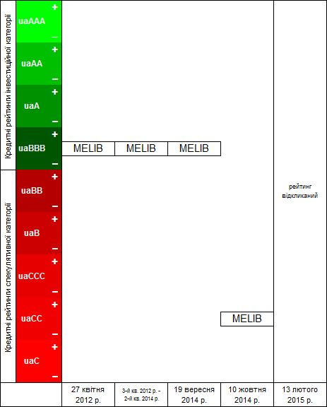 | 11 | Зниження рейтингу зі зміною прогнозу | 10.10.2014 | uaСС | в розвитку | 14/10/10-01-MELIB-КРП-011-ПОН |